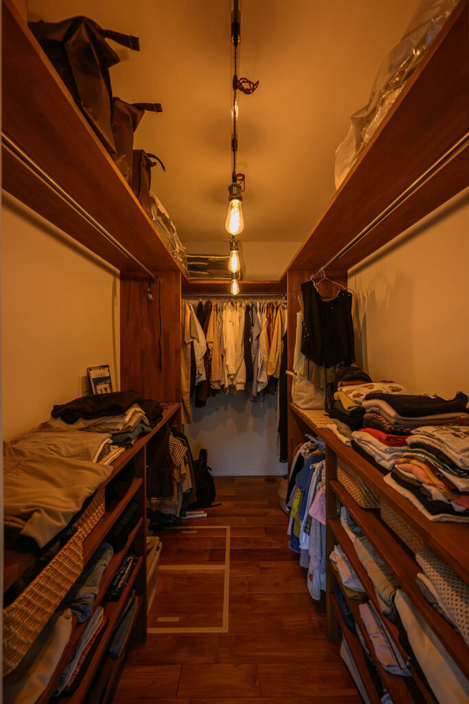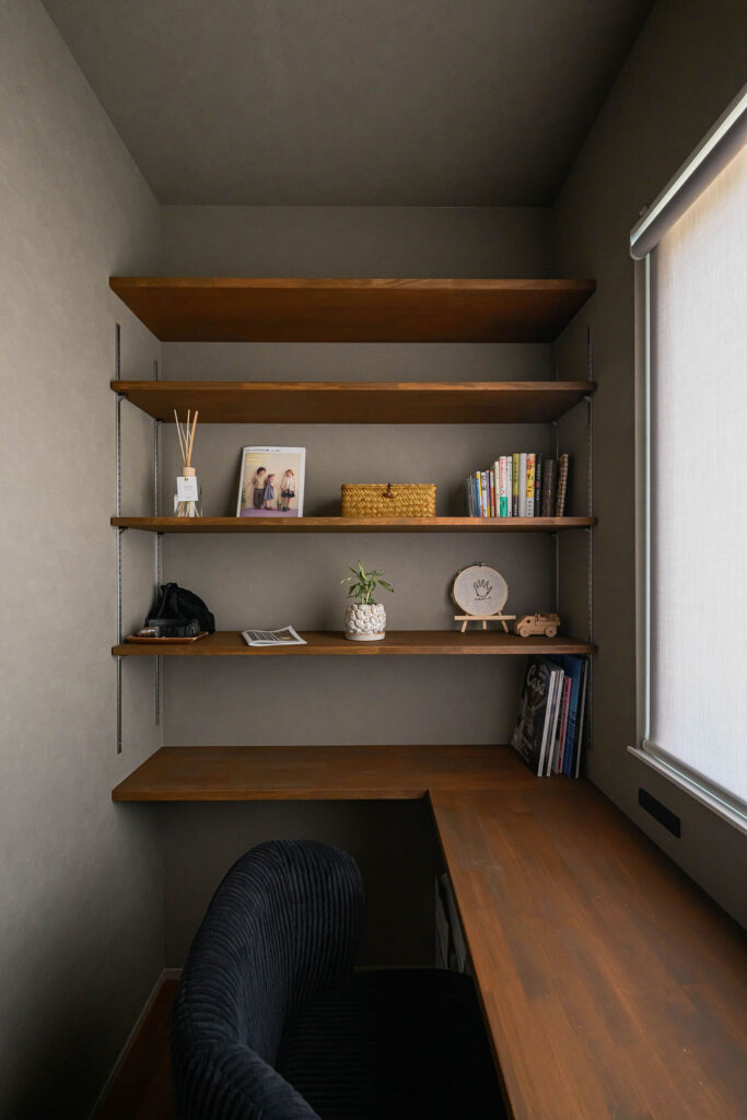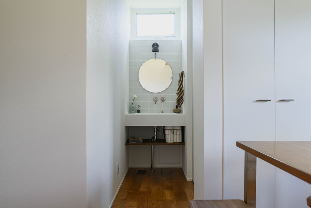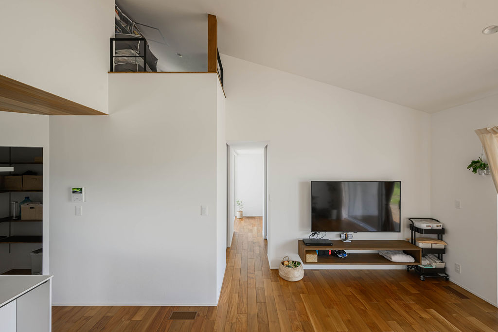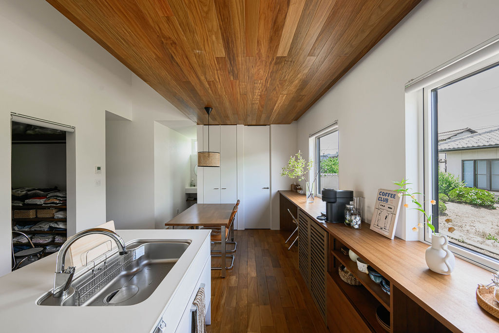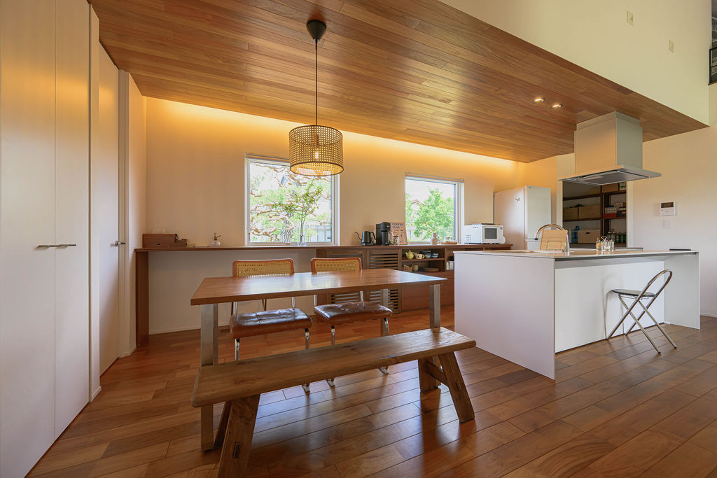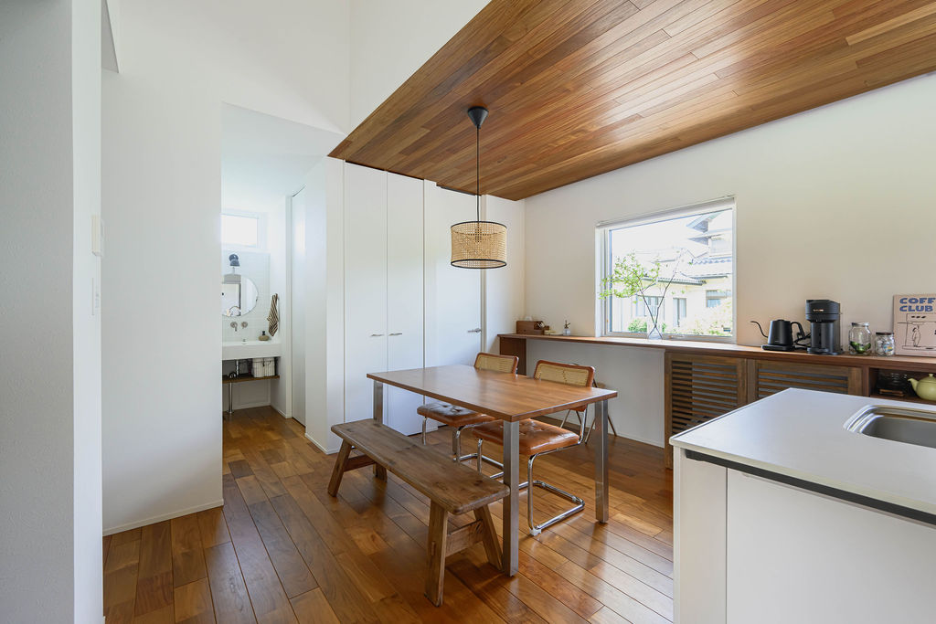 5人家族が暮らす30坪の平屋。限られた空間のなかに、暮らしやすさと心地よさを丁寧にデザインしました。深みのある色合いと豊かな木目が魅力の無垢のチーク材は、住まい全体に上質なぬくもりを添え、住まうほどに味わいを増していきます。子育てに配慮した動線や、視線が抜ける広々としたウッドデッキ、畳のロフトなど日々の暮らしを豊かにする工夫が随所に散りばめられています。玄関を入ると正面に広がるのは、大きな窓越しに見える緑豊かな庭。自然の風景と木の素材感が響き合い、住まいに奥行きと静けさをもたらします。チーク材の美しさと自然との調和、そして機能性が融合した、家族のためのやさしい平屋です。