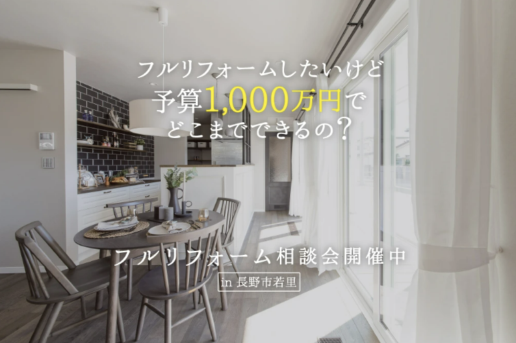 長野市 相談会長野市若里│予算1,000万円でフルリフォームはどこまで出来るの?【フルリフォーム相談会】│~11/30(日) 開催日時:11/1(土)~11/30(日) ① 10:00 / ② 13:00 / ③ 15:00