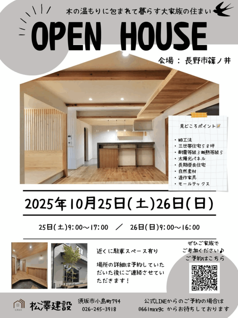 長野市篠ノ井│木の温もりに包まれ暮らす大家族の住まい見学会【断熱等級5・耐震等級3・長期優良住宅】10/25(土)・26(日)